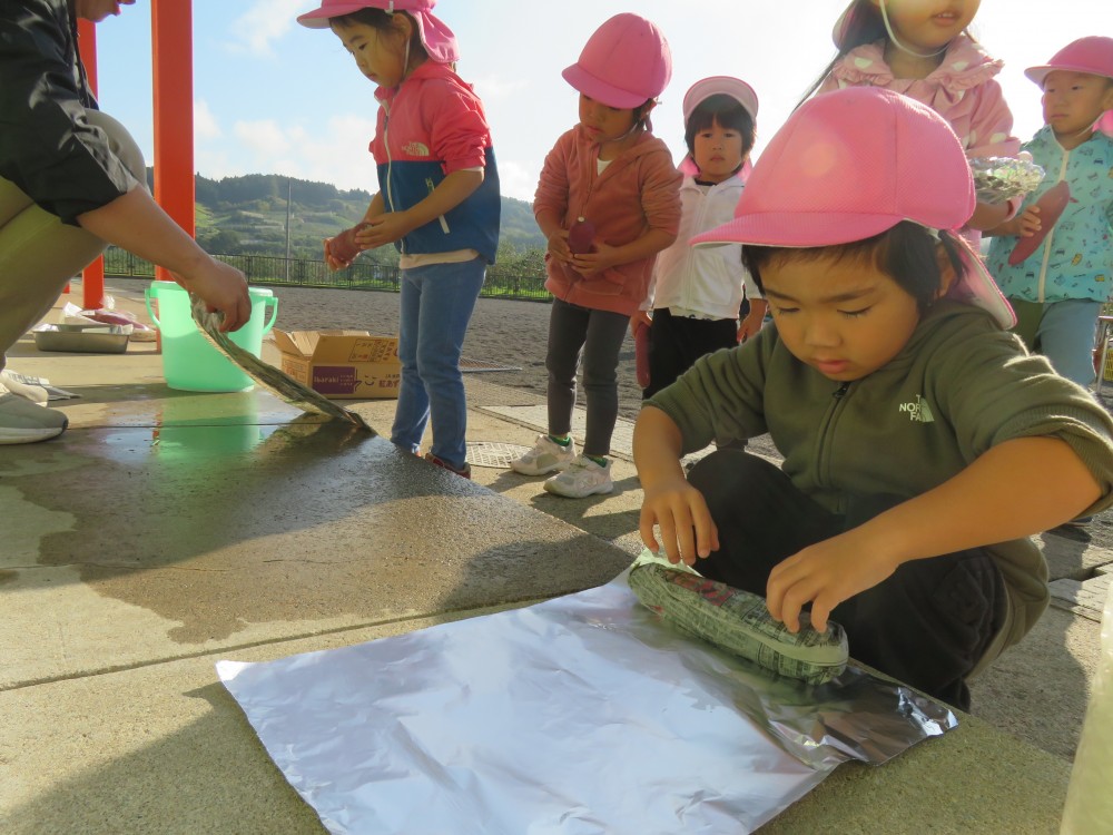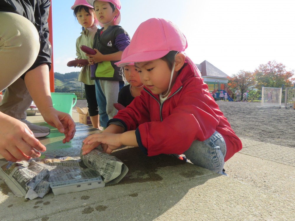 濡れた新聞紙でさつまいもをくるみ、